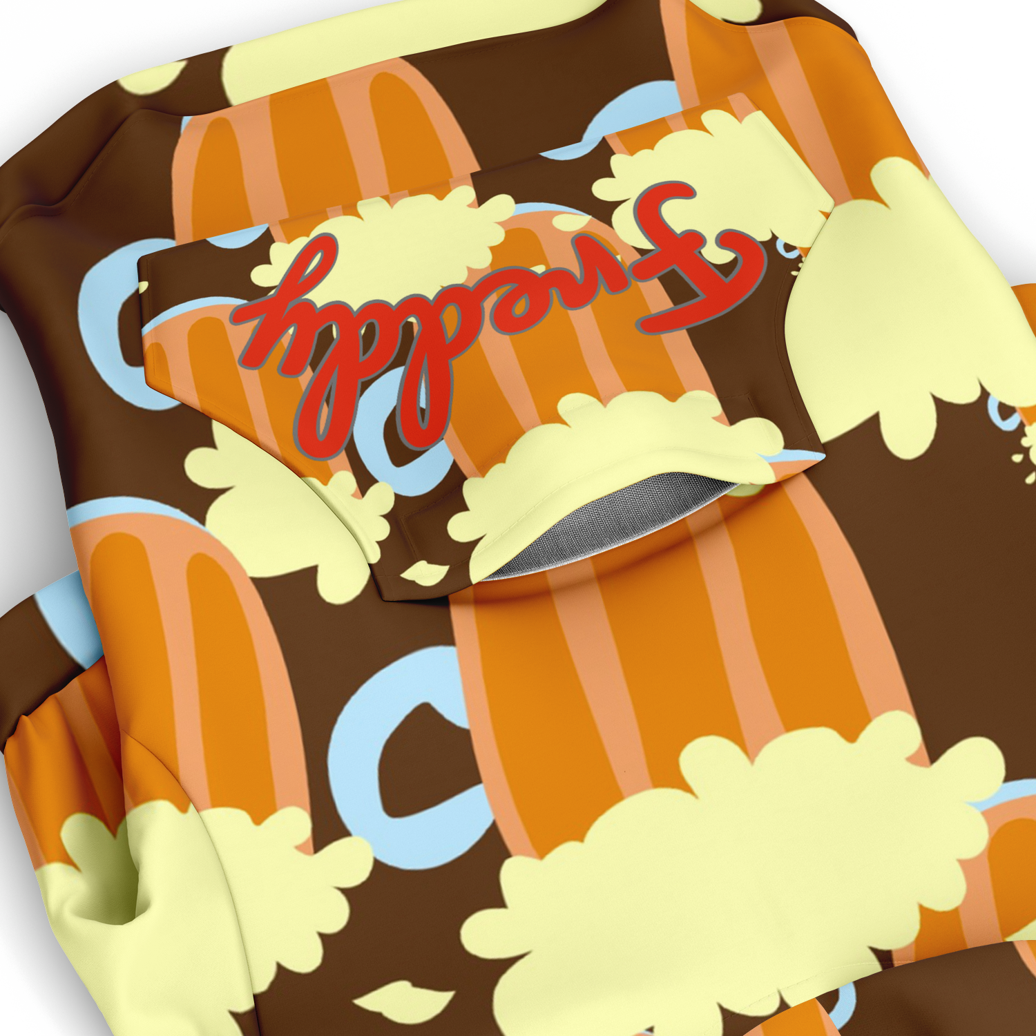 Let your dog be adventurous without compromising comfort and mobility with this all-over print zip-up hoodie. Made from a soft and durable fabric. The smooth fabric will make this your dog's most comfy zip-up hoodie ever! It also comes with a small opening on the upper back for dog harness users. And a sturdy velcro pocket located on the back to store some treats. The front zipper closure also provides easy fitting for your dog.