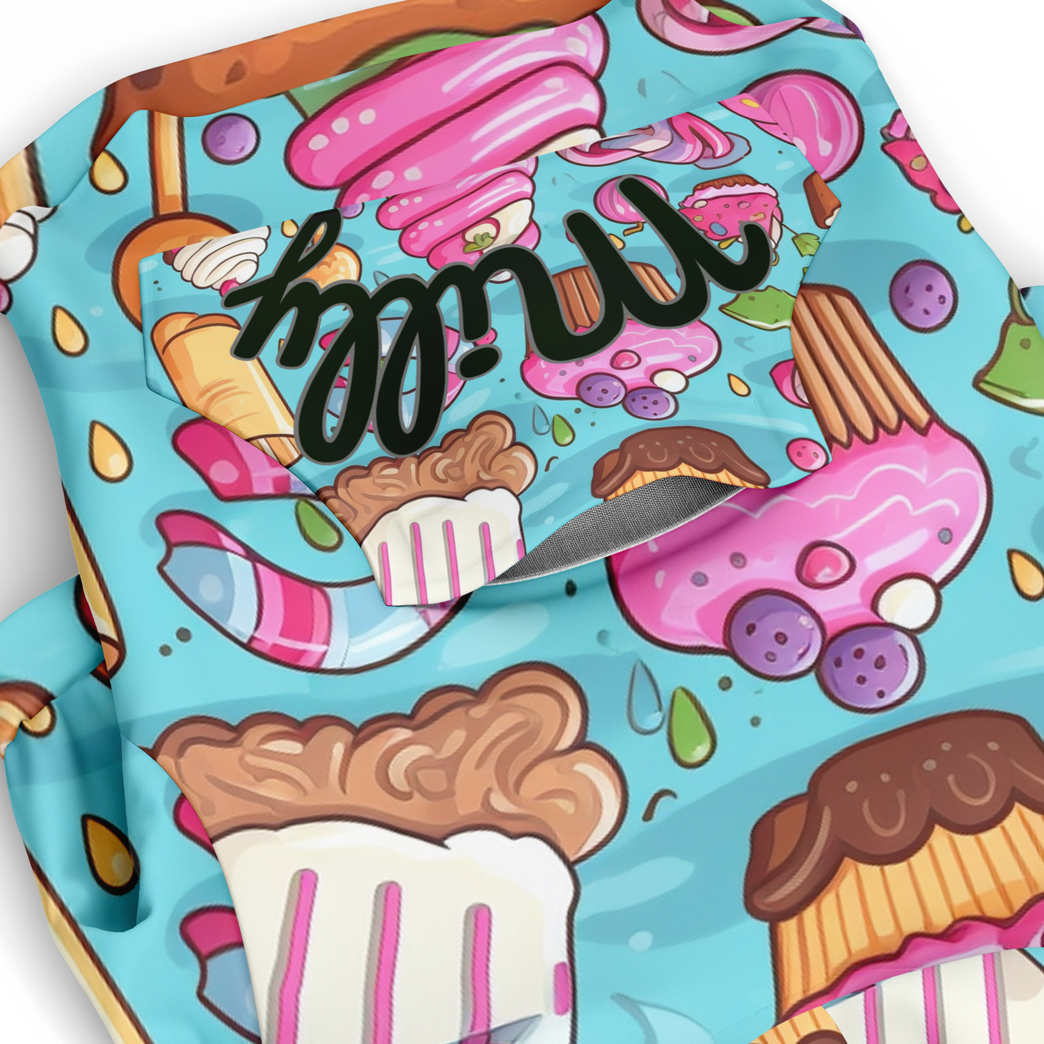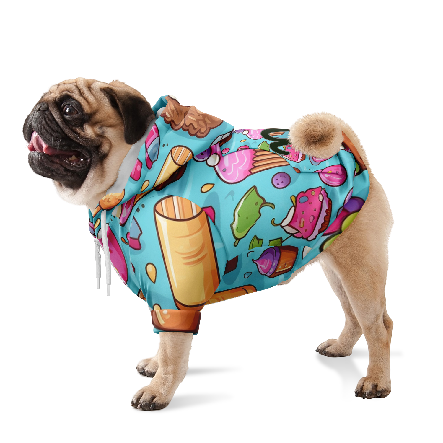 Let your dog be adventurous without compromising comfort and mobility with this all-over print zip-up hoodie. Made from a soft and durable fabric. The smooth fabric will make this your dog's most comfy zip-up hoodie ever! It also comes with a small opening on the upper back for dog harness users. And a sturdy velcro pocket located on the back to store some treats. The front zipper closure also provides easy fitting for your dog.