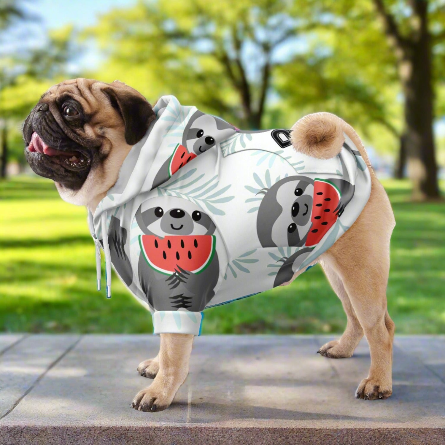 Let your dog be adventurous without compromising comfort and mobility with this all-over print zip-up hoodie. Made from a soft and durable fabric. The smooth fabric will make this your dog's most comfy zip-up hoodie ever! It also comes with a small opening on the upper back for dog harness users. And a sturdy velcro pocket located on the back to store some treats. The front zipper closure also provides easy fitting for your dog.